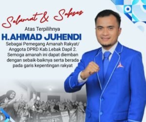 LEBAK, Berkibar di partai Demokrat H.Ahmad Juhendi terpilih sebagai anggota DPRD Kabupaten Lebak masa periode 2024- 2029 di Pemilu (pemilihan umum) tanggal 14 Pebruari 2024 kemarin.