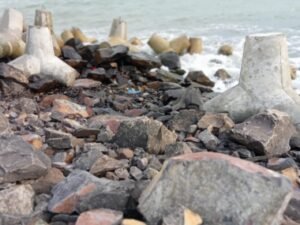 Sloope/kemiringan ini merupakan bagian lapisan armor breakwater dan pada RAB pekerjaan ini semestinya dipasang batu dengan ukuran berat 200 – 300 kg dengan void maksimum 30% per 1 m3 nya…kenyataan di lapangan terlihat dengan jelas, bagian sloope yang tidak tertutup tetrapod memiliki kondisi yang berantakan.