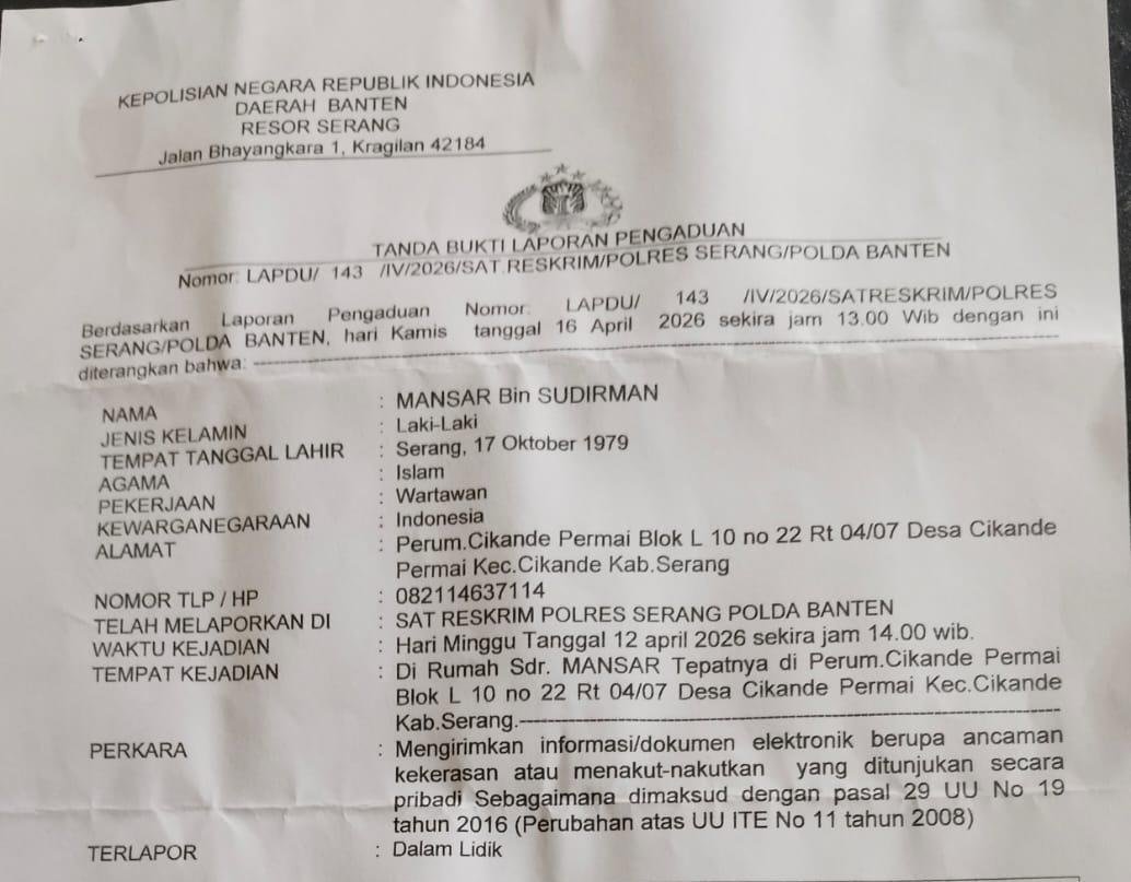 SERANG, – Mansar (47), seorang wartawan media online sekaligus Ketua Perkumpulan Wartawan Serang Timur (PERWAST), pada Kamis, 16 April 2026, membuat pengaduan ke Mapolres Serang.