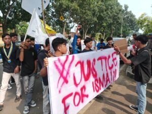 LEBAK -Buntut penonaktifan Isma Mustika Mahasiswi Poltekkes Banten,puluhan Mahasiswa yang tergabung dalam Organisasi Mahasiswa Ikatan Mahasiswa Lebak (Imala) dan PMII Lebak menggelar aksi unjuk rasa di depan Dinas Kesehatan Kabupaten Lebak dengan membawa spanduk bertuliskan Justice For Isma, Senin (29/04/2024)