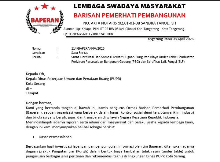 SERANG – Lembaga Swadaya Masyarakat (LSM) Barisan Pemerhati Pembangunan (Baperan) menyampaikan keberatan keras dan mengeluarkan surat somasi kepada Kepala Dinas Pekerjaan Umum dan Penataan Ruang (PUPR) Kota Serang. Langkah ini diambil setelah adanya temuan kuat dugaan praktik pungutan liar atau biaya tidak resmi (under table) dalam proses pengurusan perizinan, seperti Persetujuan Bangunan Gedung (PBG) dan Sertifikat Laik Fungsi (SLF).