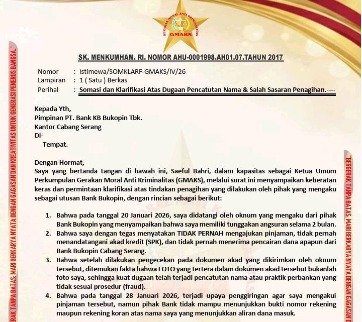 JAKARTA – Saeful Bahri, Ketua Umum Perkumpulan Gerakan Moral Anti Kriminalitas (GMAKS), menyampaikan keberatan keras terkait kasus dugaan penyalahgunaan identitas yang menimpa Supriyanto. Melalui organisasinya, Saeful meminta klarifikasi resmi dari pihak Bank Bukopin Cabang Serang terkait tindakan penagihan yang diduga merupakan praktik fraud atau pencatutan nama.