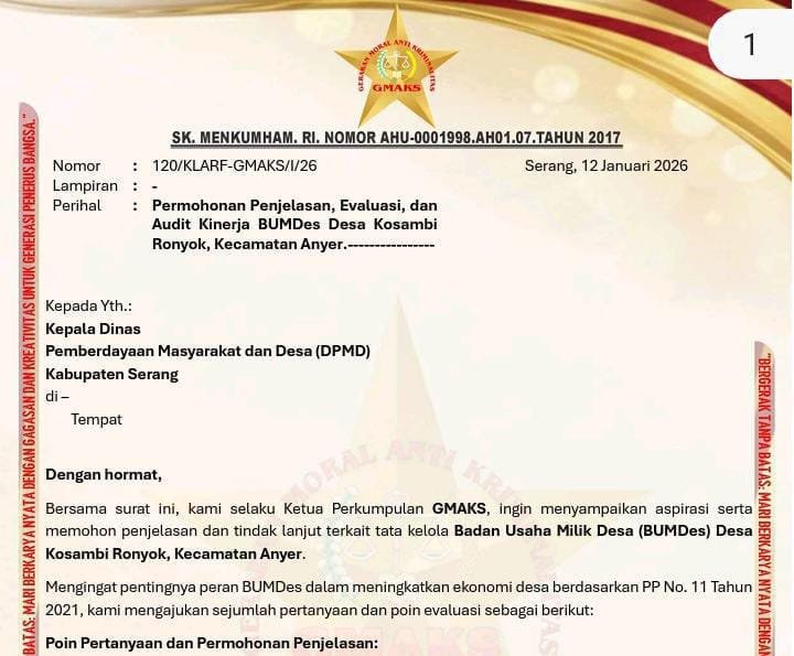 Ketua Umum Gmaks, Saeful Bahri mengatakan, karena tidak ada penjelasan dari Kepala Desa terhadap media mengenai anggaran peternakan ikan nila dan status lahan yang digunakan, maka pihaknya telah menyampaikan aspirasi sekaligus surat permohonan informasi mengenai tata kelola BUMDes Kosambi Ronyok, Kecamatan Anyer, Kabupaten Serang pada Senin (12/01/2026).