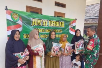 Kota Serang – Kodim 0602/Serang melalui Koramil 0602-05/Cipocok Jaya menggelar kegiatan Bakti Sosial, dengan memberikan bantuan dalam bentuk Beras 5 Kilogram sebanyak 170 Karung untuk masyarakat kurang mampu dan anak yatim, bertempat di Lingkungan Kampung Panggang Kelurahan Panancangan Kecamatan Cipocok Jaya Kota Serang, Provinsi Banten, Sabtu (08/06/2024).