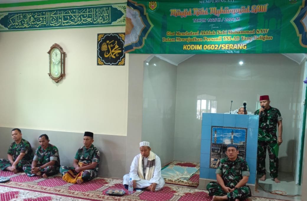 Kota Serang, – Komando Distrik Militer (Kodim) 0602/Serang menggelar acara peringatan Maulid Nabi Muhammad SAW 1446 H Tahun 2024, dengan tema “Giat Meneladani Akhlak Nabi Muhammad SAW Dalam Mewujudkan Personil TNI -AD Yang Religius”, bertempat di Masjid Al-Aqso, Makodim 0602/Serang, Kecamatan Cipocok Jaya, Kota Serang, Provinsi Banten, pada Jumat (13/09/2024).