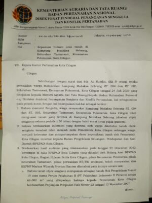 Adapun dalam uraian surat tersebut, kata Aris bahwa kepastian hukum atas tanah Kampung medaksa sebrang, Kelurahan Tamansari Kecamatan pulomerak, Kota Cilegon, BERUPA SURAT tanggal 17 Oktober 2023 langsung dari Kementerian ATR/BPN melalui Direktorat Jenderal Penanganan Sengketa dan Konflik Pertanahan yang ditujukan kepada Kepala Kantor Pertanahan Kota Cilegon.