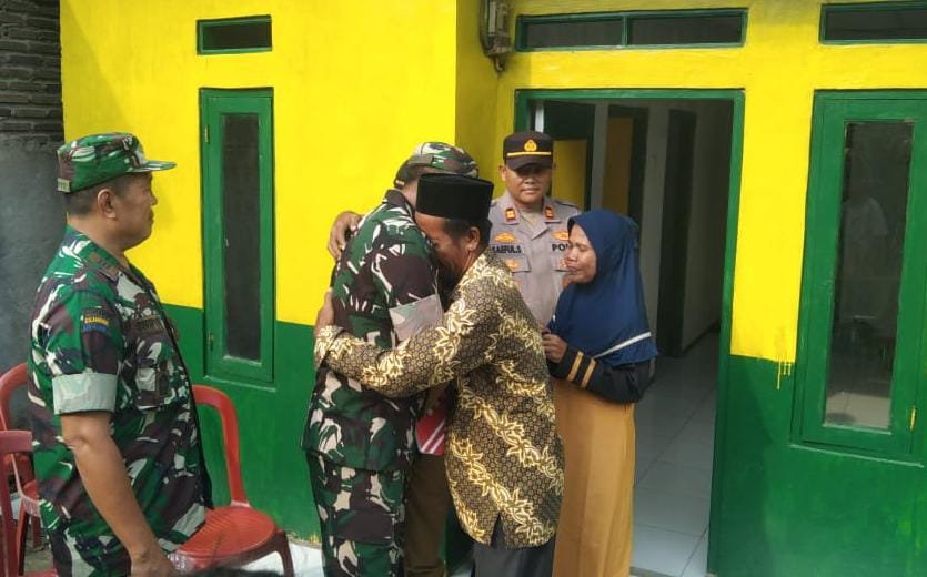 Serang, KV- Tampak terlihat suasana penuh haru, waktu Komandan Kodim (Dandim) 0602/Serang Kolonel Inf Mulyo Junaidi dipeluk oleh Jumri bersama keluarganya, kegiatan tersebut pada saat secara simbolis menyerahkan kunci rumah program Perehaban Rumah Tidak Layak Huni (Rutilahu), bertempat di Kampung Kampung Warakas Desa Lamaran Kecamatan Binuang Kabupaten Serang, Provinsi Banten, Rabu (05/06/2024).