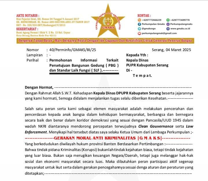 SERANG,klikviral.com – Perkumpulan Gerakan Moral Anti Kriminalitas (Gmaks), mempertanyakan izin Persetujuan Bangunan Gedung (PBG) dan izin Sertifikat Laik Fungsi (SLF) PT Dinar Texindo Utama (STU) yang berada di Desa Parakan Kecamatan Jawilan Kabupaten Serang. Guna memastikan, lembaga tersebut melayangkan surat Permohonan Informasi kepada Dinas Pekerjaan Umum dan Penataan Ruang (PUPR) Kabupaten Serang.