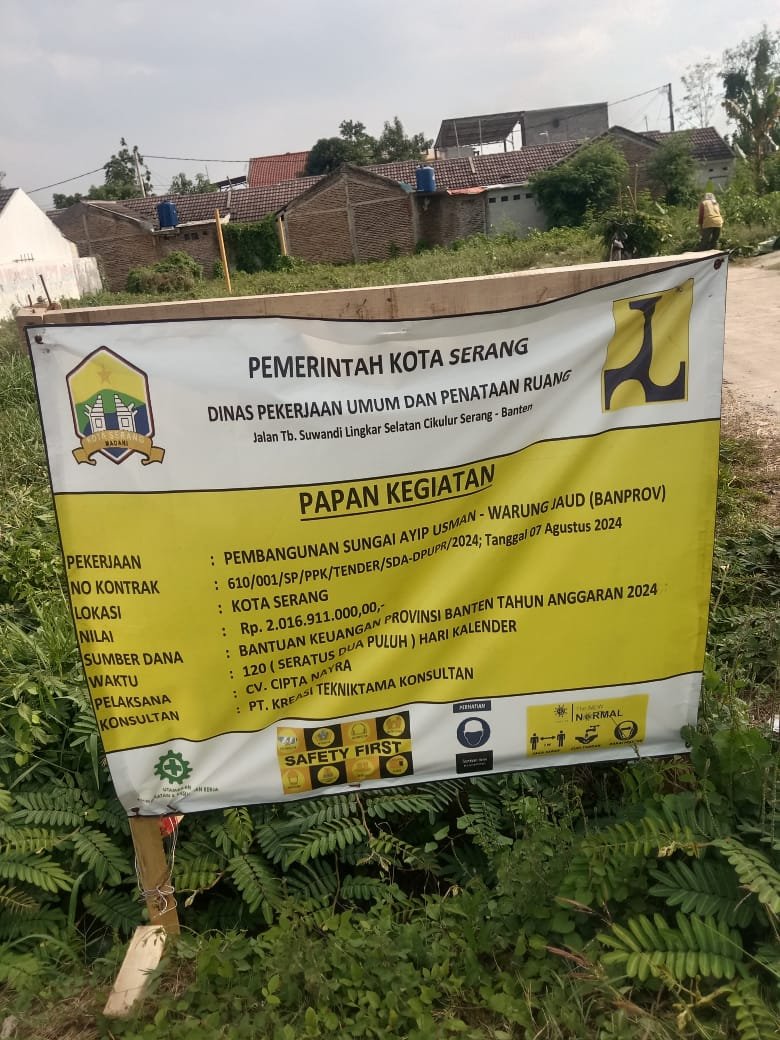 Informasi yang didapat, proyek tersebut merupakan kegiatan dari Dinas PUPR Kota Serang untuk proyek Pembangunan Sungai Ayip Usman Warung Jaud, dengan nilai kontrak Rp 2.016.911 bersumber dari Bantuan Provinsi (Banprov) tahun 2024.