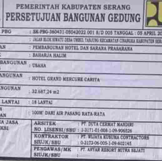 SERANG, klikviral.com – Mega Projek Pembangunan gedung Hotel Grand Mercure, 18 lantai, yang berlokasi di Desa Umbul Tanjung Kecamatan Cinangka Kabupaten Serang, nantinya akan menjadi salah satu hotel bintang lima termegah dan terbesar di provinsi Banten, sebagai pelaksana projeknya dikerjakan oleh kontraktor PT Wijaya Kusuma Contraktors, Arsitektur PT Duta Cermat Mandiri, dan Pengawas PT Anyar Resort Mitra Sejati.