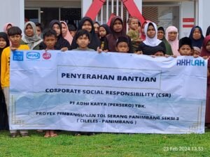 PANDEGLANG, klikviral.com – Corporate Social Responsibility Program (CSR) dari PT Adhi Karya Persero, Tbk menggelar Bantuan Sosial berupa paket sembako untuk anak-anak yatim dari beberapa wilayah yang terdampak pembangunan jalan tol serang – panimbang