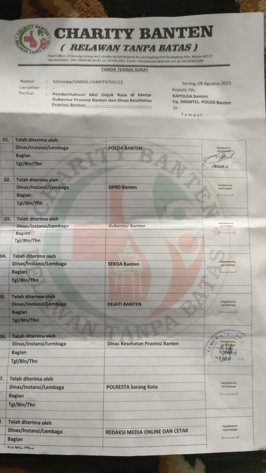 Relawan Charity Banten bersama dengan Delapan Ormas pendukung akan gelar aksi unjuk rasa di gedung Gubernur Banten dan Dinkes Banten, Selasa (15/8).