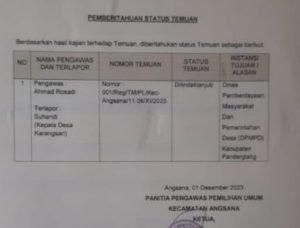 Hal ini berdasarkan surat pemberitahuan status temuan hasil kajian Panwaslu Kecamatan Angsana pertanggal 1 Desember 2023, dengan no Temuan : 001/REG/TMPL/Kec.Angsana/11.06/XI/2023,selaku pengawas Ahmad Rosadi, terlapor Suhandi (Kepala Desa Karangsari), dengan status Ditindak lanjuti,dan instansi tujuan kepada Dinas Pemberdayaan Masyarakat Dan Pemerintahan Desa (DPMPD) Pandeglang, dengan diketahui oleh Jojon Sulaeman,SH ketua Panwaslu Kecamatan Angsana.