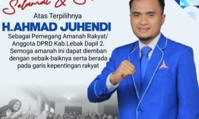 Maret 2, 2024LEBAK, Berkibar di partai Demokrat H.Ahmad Juhendi terpilih sebagai anggota DPRD Kabupaten Lebak masa periode 2024-...