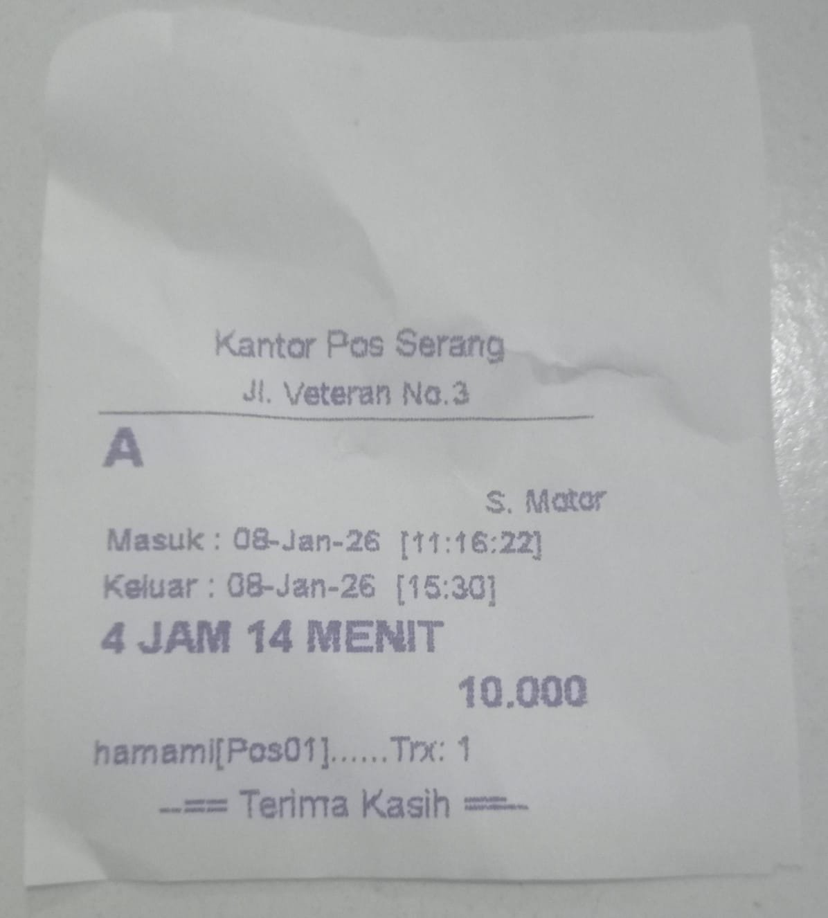 Nanang mengaku dirinya baru kali pertama memarkirkan motor miliknya di kantor pos. Dalam keterangan, diketahui Tarif satu jam pertama sebesar Rp2.000 dan jam berikutnya senilai Rp2.000 tanpa batas maksimal.